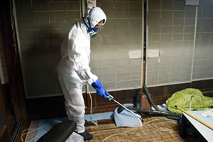 防護服を着用した特殊清掃員が手作業で体液が浸みこんだカーペットや畳、ベッドマット等を梱包、その他生活ゴミ等が汚染されていれば袋詰め、撤去していきます。