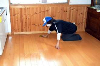 台所で生ものの処分を進める背後では、すでに床の清掃に取り掛かっております。