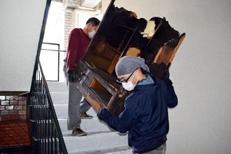 このような火災ごみでは移動の際に煤が舞う事も懸念されますので、基本的にはエレベーターを使用せず、非常階段からの搬出となる事が多い為、非常に重労働であります。