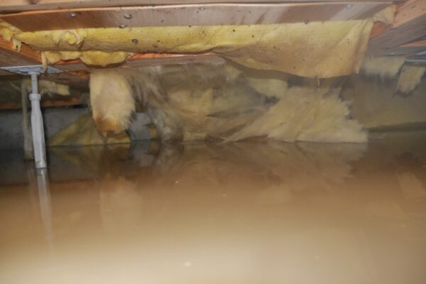 汚泥が床下に流れ込んで、断熱材も給水してしまい落ちていました。清掃消毒を施して断熱材を設置して元通りに復旧しました。